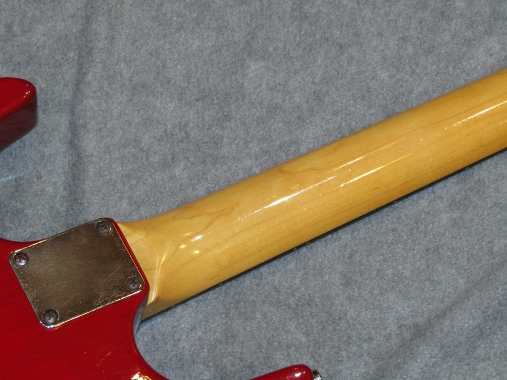 良質なメイプルネックに漆黒のエボニー指板、HAMERファンには堪らない”ブーメランインレイ”、シースルーのラッカー塗装からのぞくアルダーも良質です。